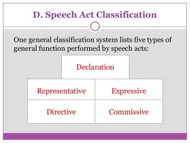 Speech act theory has been used to model conversations for automated classification and retrieval. When applied to the analysis of direct discourse by a character within a literary work it provides a systematicframework for identifying the unspoken presuppositions implications and effects of speech acts that competent readers and critics have always taken into. Searles Classifications of Speech Act As a response to Austins Speech Act Theory John Searle 1976 a professor from the University of California Berkeley classified illocutionary acts into five distinct categories.