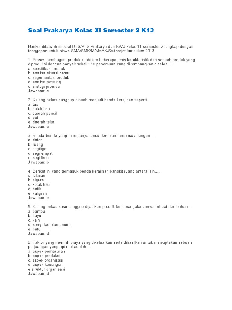 SOAL PKN SMK Kelas XI Semester Genap by elhasri in Types School Work soal pkn smk kelas xi. Berikut contoh soal PKN dengan jawabannya untuk. Soal UTS Prakarya Kelas 11 SMAMA 80 Contoh Soal UTS Prakarya Kelas 11 SMAMA dan Kunci Jawabnya Terbaru - Bagi sahabat bospedia dimana saja berada yang ingin sekali mempelajari Soal UTS Prakarya Kelas 11 SMAMA ini adik adik bisa menguduh materi ini di bospedia dalam bentuk file doc.